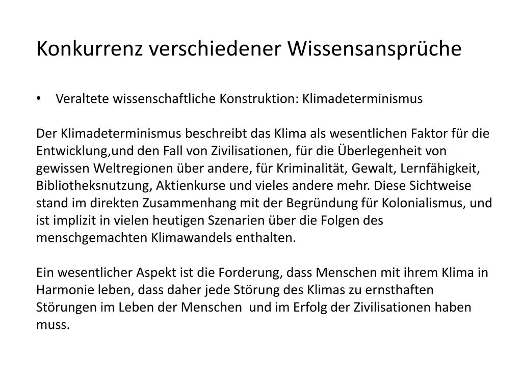 KonkurrenzverschiedenerWissensansprüche • VeraltetewissenschaftlicheKonstruktion: Klimadeterminismus • Der Klimadeterminismus beschreibt das Klima als wesentlichen Faktor für die Entwicklung,und den Fall von Zivilisationen, für die Überlegenheit von gewissen Weltregionen über andere, für Kriminalität, Gewalt, Lernfähigkeit, Bibliotheksnutzung, Aktienkurse und vieles andere mehr. Diese Sichtweise stand im direkten Zusammenhang mit der Begründung für Kolonialismus, und ist implizit in vielen heutigen Szenarien über die Folgen des menschgemachten Klimawandels enthalten. • Ein wesentlicher Aspekt ist die Forderung, dass Menschen mit ihrem Klima in Harmonie leben, dass daher jede Störung des Klimas zu ernsthaften Störungen im Leben der Menschen und im Erfolg der Zivilisationen haben muss.