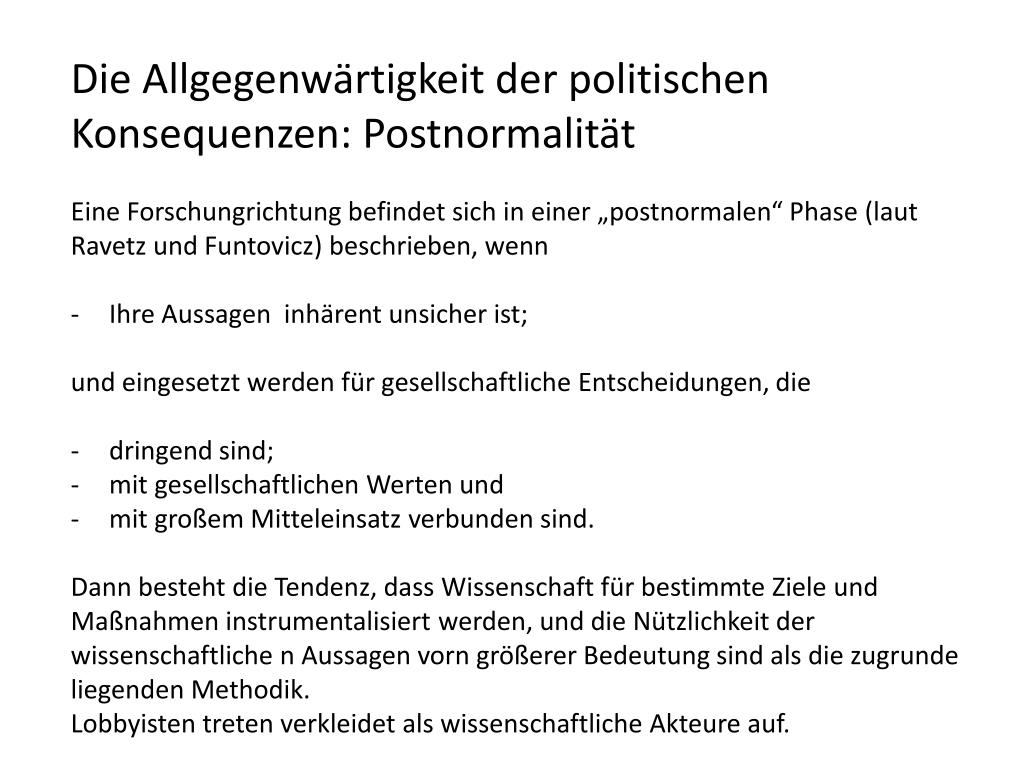 Die Allgegenwärtigkeit der politischen Konsequenzen: Postnormalität • Eine Forschungrichtung befindet sich in einer „postnormalen“ Phase (laut Ravetz und Funtovicz) beschrieben, wenn • Ihre Aussagen inhärent unsicher ist; • und eingesetzt werden für gesellschaftliche Entscheidungen, die • dringend sind; • mit gesellschaftlichen Werten und • mit großem Mitteleinsatz verbunden sind. • Dann besteht die Tendenz, dass Wissenschaft für bestimmte Ziele und Maßnahmen instrumentalisiert werden, und die Nützlichkeit der wissenschaftliche n Aussagen vorn größerer Bedeutung sind als die zugrunde liegenden Methodik. • Lobbyisten treten verkleidet als wissenschaftliche Akteure auf.