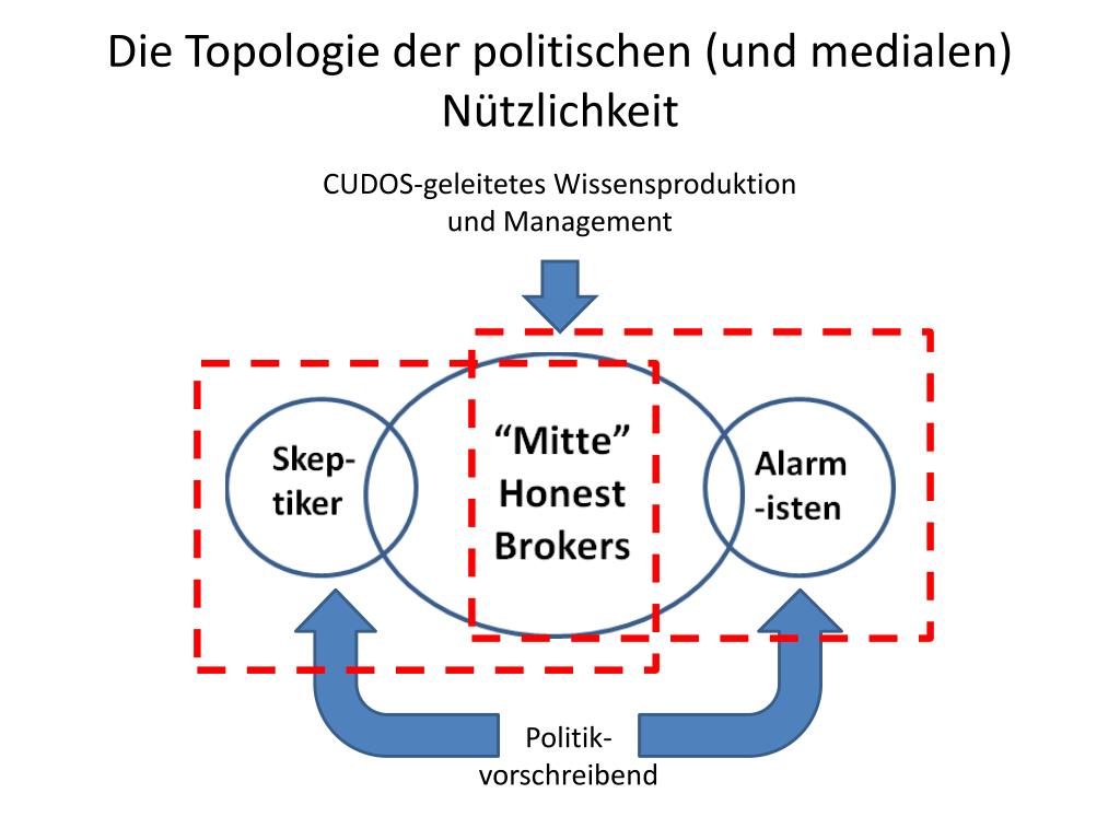Es geht um das Miteinander von Gesellschaft (Öffentlichkeit, Politik, Wirtschaft, Medien) und Wissenschaft. Inwieweit ist Wissenschaft unabhängig von Gesellschaft, inwieweit ist Gesellschaft von Wissenschaft abhängig? Was für eine Wissenschaft will die Gesellschaft haben? Welche Funktion soll sie haben? – Eine Art staatlich finanziertes Greenpeace oder Burschenschaften? Oder einen CUDOS-geleiteten „Honest Broker“?