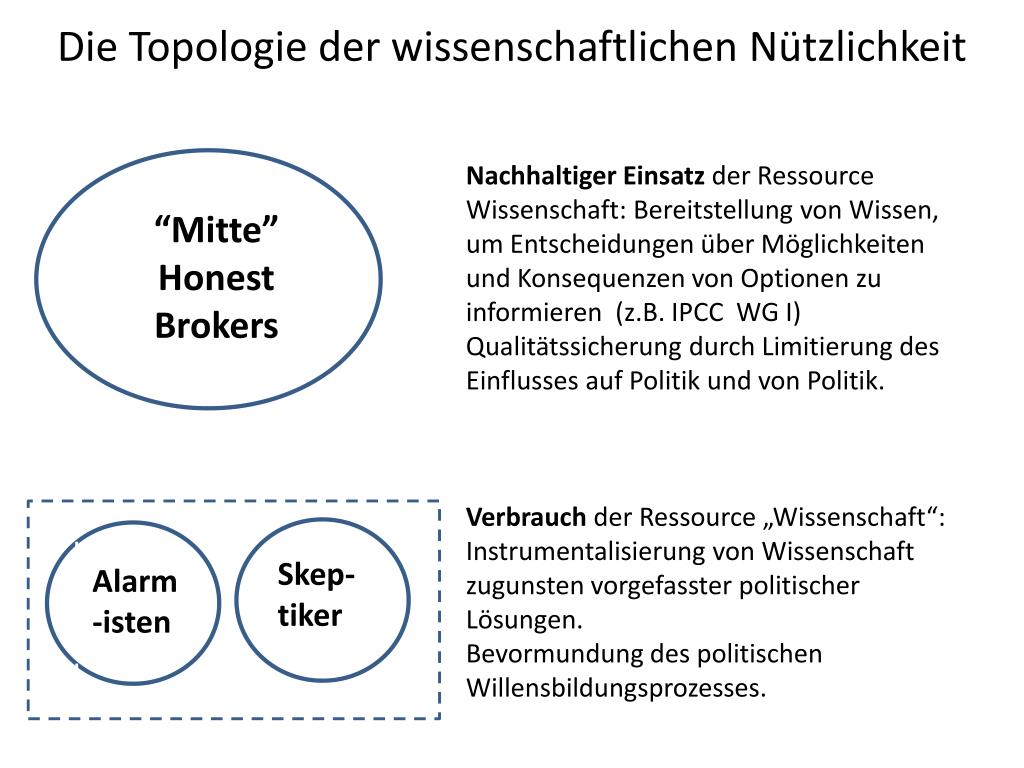 Die Topologie der wissenschaftlichenNützlichkeit Nachhaltiger Einsatz der Ressource Wissenschaft: Bereitstellung von Wissen, um Entscheidungen über Möglichkeiten und Konsequenzen von Optionen zu informieren (z.B. IPCC WG I) Qualitätssicherung durch Limitierung des Einflusses auf Politik und von Politik. Verbrauch der Ressource „Wissenschaft“: Instrumentalisierung von Wissenschaft zugunsten vorgefasster politischer Lösungen. Bevormundung des politischen Willensbildungsprozesses. “Mitte” Honest Brokers Skep-tiker Alarm-isten