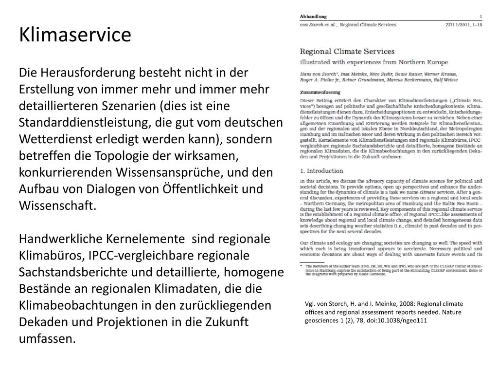 Klimaservice • Die Herausforderung besteht nicht in der Erstellung von immer mehr und immer mehr detaillierteren Szenarien (dies ist eine Standarddienstleistung, die gut vom deutschen Wetterdienst erledigt werden kann), sondern betreffen die Topologie der wirksamen, konkurrierenden Wissensansprüche, und den Aufbau von Dialogen von Öffentlichkeit und Wissenschaft. • Handwerkliche Kernelemente sind regionale Klimabüros, IPCC-vergleichbareregionale Sachstandsberichte und detaillierte, homogene Bestände an regionalen Klimadaten, die die Klimabeobachtungen in den zurückliegenden Dekaden und Projektionen in die Zukunft umfassen. Vgl. von Storch, H. and I. Meinke, 2008: Regional climate offices and regional assessment reports needed. Nature geosciences 1 (2), 78, doi:10.1038/ngeo111