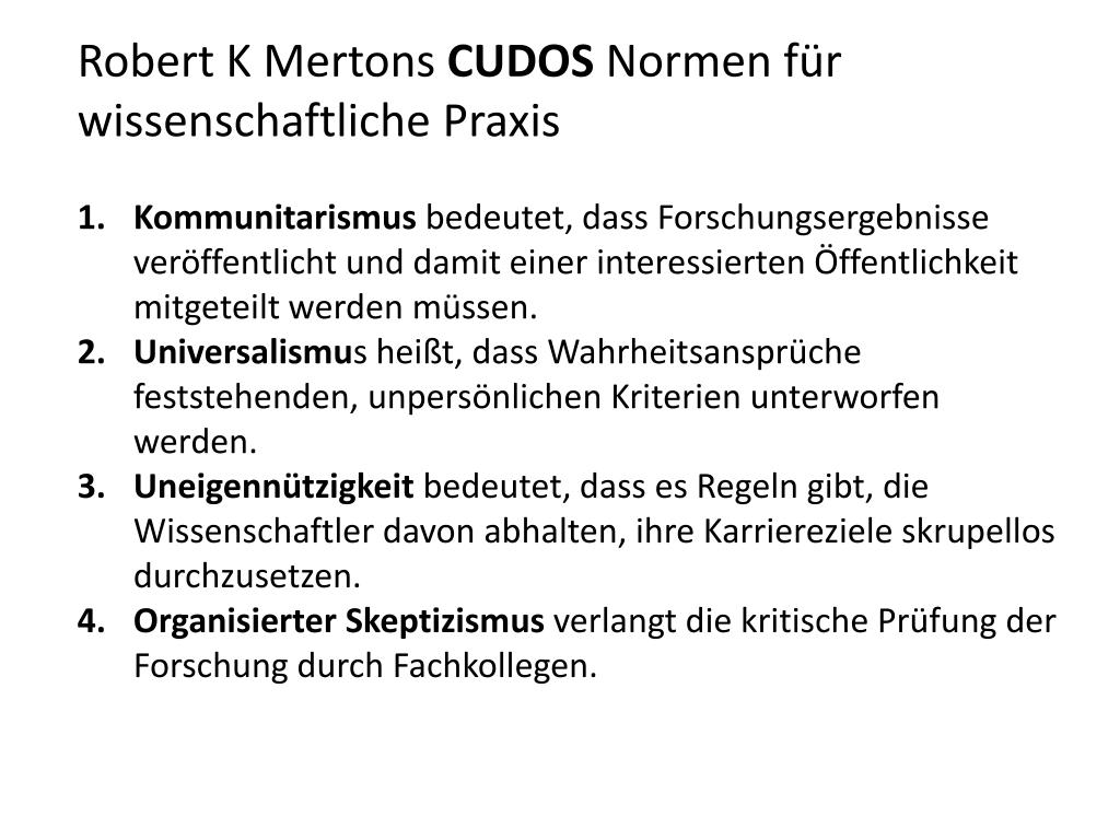 Robert K Mertons CUDOS Normen für wissenschaftliche Praxis Kommunitarismusbedeutet, dass Forschungsergebnisse veröffentlicht und damit einer interessierten Öffentlichkeit mitgeteilt werden müssen. Universalismus heißt, dass Wahrheitsansprüche feststehenden, unpersönlichen Kriterien unterworfen werden. Uneigennützigkeitbedeutet, dass es Regeln gibt, die Wissenschaftler davon abhalten, ihre Karriereziele skrupellos durchzusetzen. Organisierter Skeptizismus verlangt die kritische Prüfung der Forschung durch Fachkollegen.