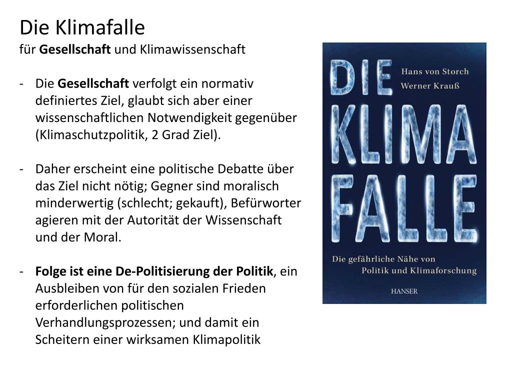 Die Klimafalle • für Gesellschaft und Klimawissenschaft • Die Gesellschaft verfolgt ein normativ definiertes Ziel, glaubt sich aber einer wissenschaftlichen Notwendigkeit gegenüber (Klimaschutzpolitik, 2 Grad Ziel). • Daher erscheint eine politische Debatte über das Ziel nicht nötig; Gegner sind moralisch minderwertig (schlecht; gekauft), Befürworter agieren mit der Autorität der Wissenschaft und der Moral. • Folge ist eine De-Politisierung der Politik, ein Ausbleiben von für den sozialen Frieden erforderlichen politischen Verhandlungsprozessen; und damit ein Scheitern einer wirksamen Klimapolitik