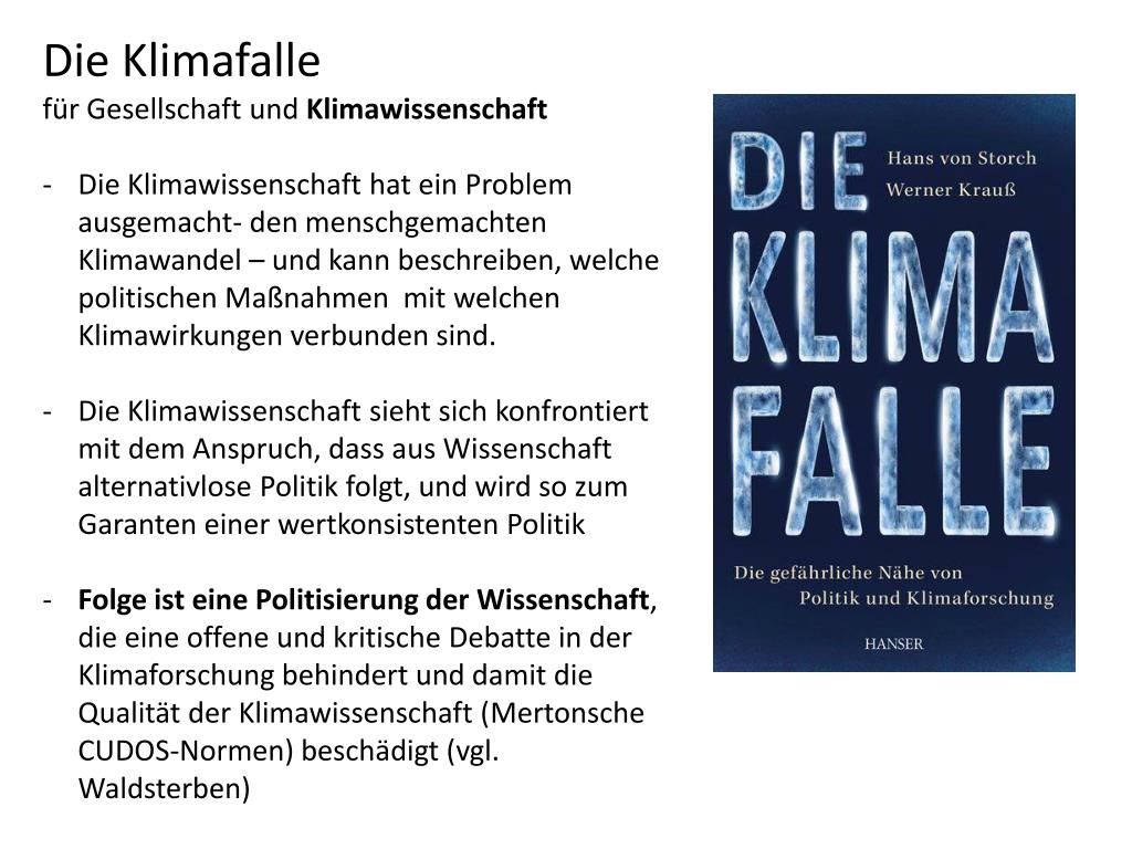 Die Klimafalle • für Gesellschaft und Klimawissenschaft • Die Klimawissenschaft hat ein Problem ausgemacht- den menschgemachten Klimawandel – und kann beschreiben, welche politischen Maßnahmen mit welchen Klimawirkungen verbunden sind. • Die Klimawissenschaft sieht sich konfrontiert mit dem Anspruch, dass aus Wissenschaft alternativlose Politik folgt, und wird so zum Garanten einer wertkonsistenten Politik • Folge ist eine Politisierung der Wissenschaft, die eine offene und kritische Debatte in der Klimaforschung behindert und damit die Qualität der Klimawissenschaft (Mertonsche CUDOS-Normen) beschädigt (vgl. Waldsterben)