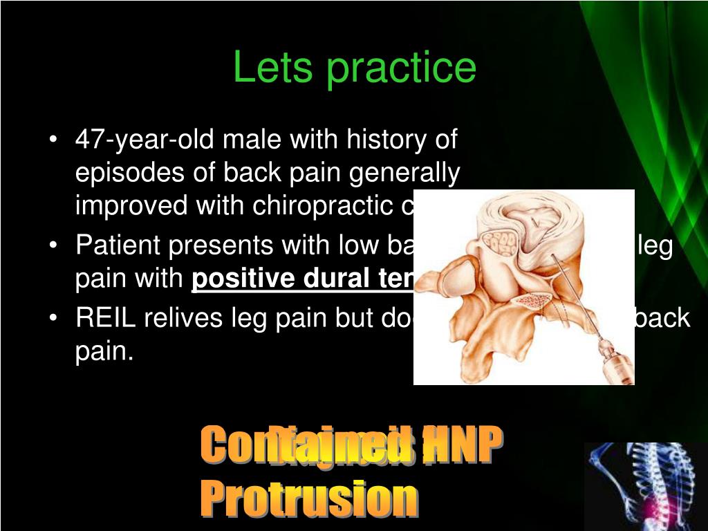 47-year-old male with history of episodes of back pain generally improved with chiropractic care in the past. Patient presents with low back and peripheral leg pain with positive dural tension signs. REIL relives leg pain but does not relieve low back pain. Lets practice Contained HNP Protrusion Diagnosis ?