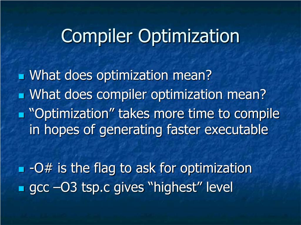 Compiler Optimization • What does optimization mean? • What does compiler optimization mean? • “Optimization” takes more time to compile in hopes of generating faster executable • -O# is the flag to ask for optimization • gcc –O3 tsp.c gives “highest” level