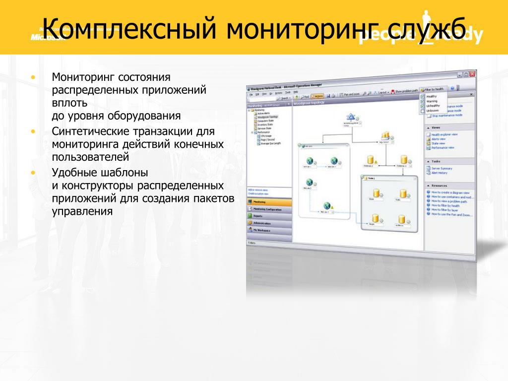 Мониторинг состояния распределенных приложений вплоть до уровня оборудования Синтетические транзакции для мониторинга действий конечных пользователей Удобные шаблоны и конструкторы распределенных приложений для создания пакетов управления Комплексный мониторинг служб