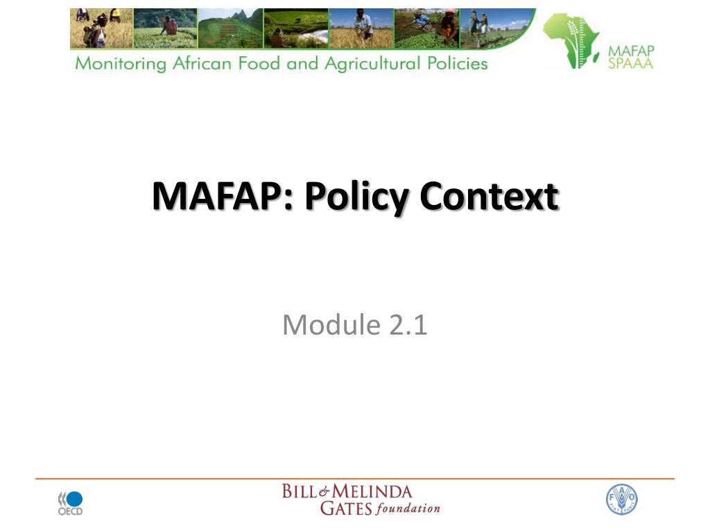 Overview • To achieve their objectives in the food and agriculture sector, governments can use: • policies, and • supporting public expenditures • The MAFAP project focuses on three main monitoring domains: • incentives and disincentives resulting from policies in place • public expenditures, including national budget and aid flows • performance and development indicators.