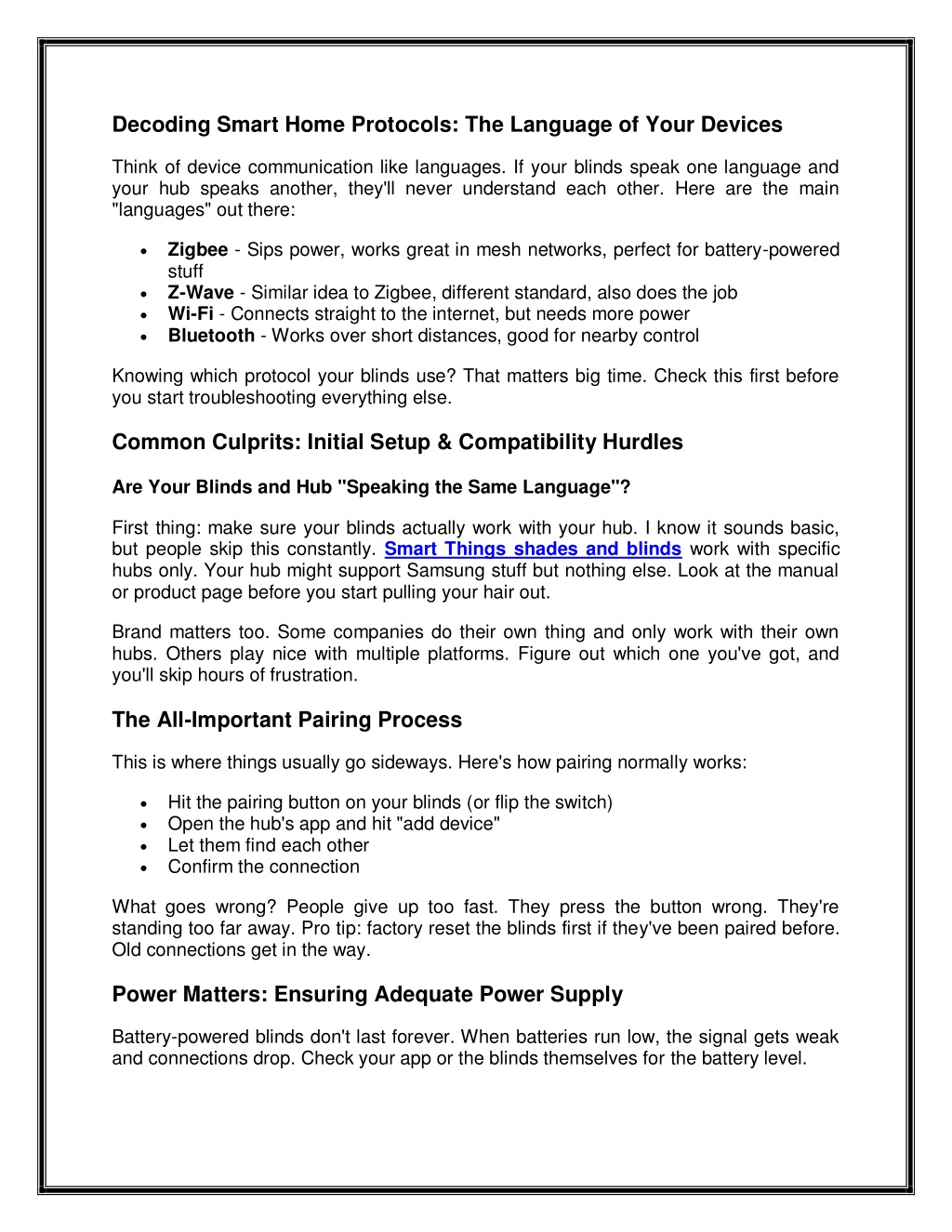 2. Decoding Smart Home Protocols: The Language of Your Devices Think of device communication like languages. If your blinds speak one language and your hub speaks another, they'll never understand each other. Here are the main "languages" out there: Zigbee - Sips power, works great in mesh networks, perfect for battery-powered stuff Z-Wave - Similar idea to Zigbee, different standard, also does the job Wi-Fi - Connects straight to the internet, but needs more power Bluetooth - Works over short distances, good for nearby control Knowing which protocol your blinds use? That matters big time. Check this first before you start troubleshooting everything else. Common Culprits: Initial Setup & Compatibility Hurdles Are Your Blinds and Hub "Speaking the Same Language"? First thing: make sure your blinds actually work with your hub. I know it sounds basic, but people skip this constantly. Smart Things shades and blinds work with specific hubs only. Your hub might support Samsung stuff but nothing else. Look at the manual or product page before you start pulling your hair out. Brand matters too. Some companies do their own thing and only work with their own hubs. Others play nice with multiple platforms. Figure out which one you've got, and you'll skip hours of frustration. The All-Important Pairing Process This is where things usually go sideways. Here's how pairing normally works: Hit the pairing button on your blinds (or flip the switch) Open the hub's app and hit "add device" Let them find each other Confirm the connection What goes wrong? People give up too fast. They press the button wrong. They're standing too far away. Pro tip: factory reset the blinds first if they've been paired before. Old connections get in the way. Power Matters: Ensuring Adequate Power Supply Battery-powered blinds don't last forever. When batteries run low, the signal gets weak and connections drop. Check your app or the blinds themselves for the battery level.