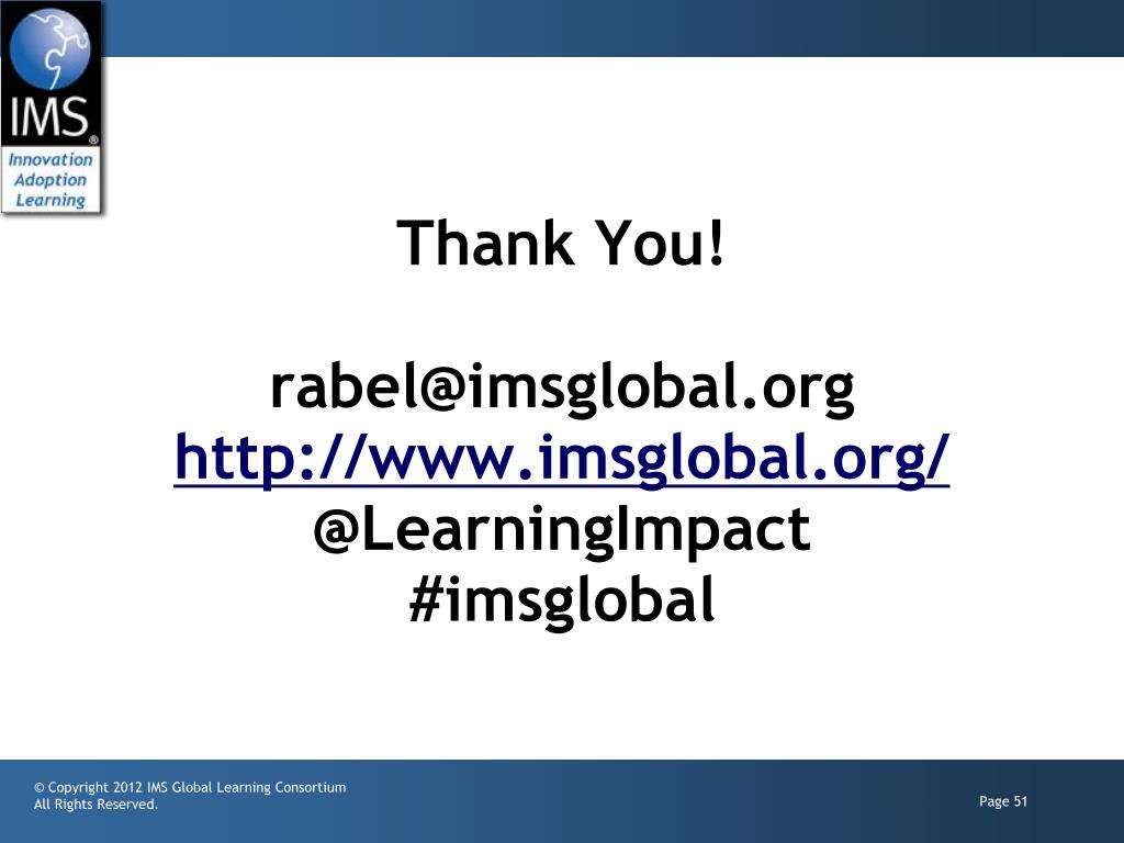 Thank You!rabel@imsglobal.orghttp://www.imsglobal.org/@LearningImpact#imsglobal