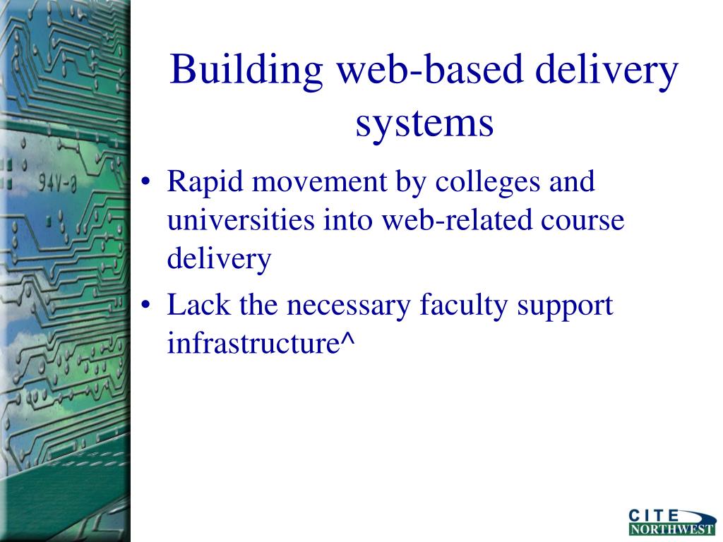 Building web-based delivery systems • Rapid movement by colleges and universities into web-related course delivery • Lack the necessary faculty support infrastructure^