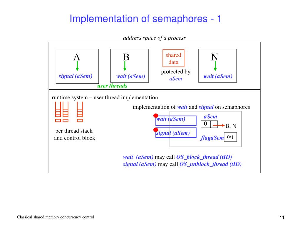 0 B, N Implementation of semaphores - 1 address space of a process A B N shared data protected by aSem signal (aSem) wait (aSem) wait (aSem) user threads runtime system – user thread implementation implementation of wait and signal on semaphores aSem wait (aSem) signal (aSem) per thread stack and control block flagaSem 0/1 wait (aSem) may call OS_block_thread (tID) signal (aSem) may call OS_unblock_thread (tID) Classical shared memory concurrency control