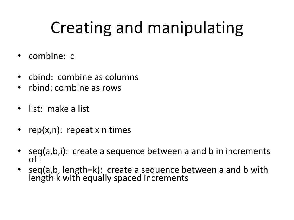 Creating and manipulating • combine: c • cbind: combine as columns • rbind: combine as rows • list: make a list • rep(x,n): repeat x n times • seq(a,b,i): create a sequence between a and b in increments of i • seq(a,b, length=k): create a sequence between a and b with length k with equally spaced increments