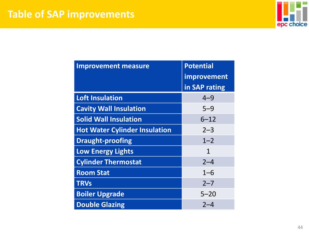 Danger signs Clearly some properties will have significantly lower rating and may well have limited opportunities for improvement So what are the danger signs in a property? • Solid Brick properties can pose a problem as solid wall insulation is not a viable option • Larger properties 200 sq m+ and detached will be at a disadvantage as they are losing heat from larger areas of wall • The obvious absence of double glazing or loft insulation • Properties with a high number of open fires • Properties with no gas supply – if the property is using oil, LPG, coal , logs or wood pellets and, too a lesser degree, electricity