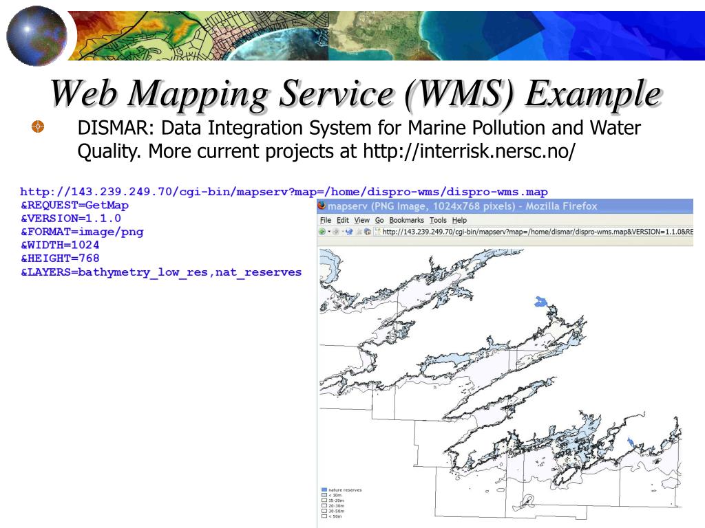 GetMap Operation Web Mapping Service (WMS) Example • DISMAR: Data Integration System for Marine Pollution and Water Quality. More current projects at http://interrisk.nersc.no/