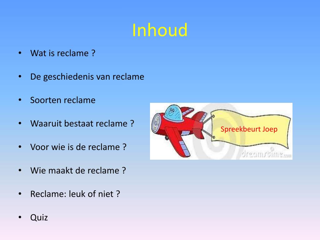 Inhoud • Wat is reclame ? • De geschiedenis van reclame • Soorten reclame • Waaruit bestaat reclame ? • Voor wie is de reclame ? • Wie maakt de reclame ? • Reclame: leuk of niet ? • Quiz Spreekbeurt Joep