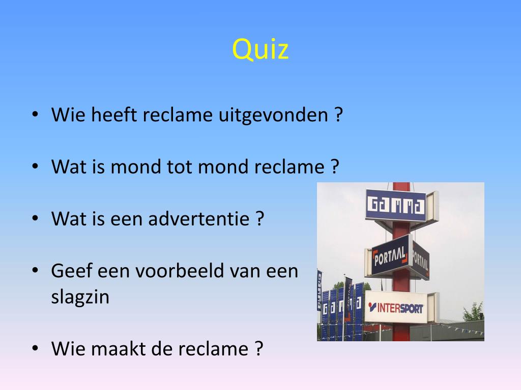 Quiz • Wie heeft reclame uitgevonden ? • Wat is mond tot mond reclame ? • Wat is een advertentie ? • Geef een voorbeeld van een slagzin • Wie maakt de reclame ?