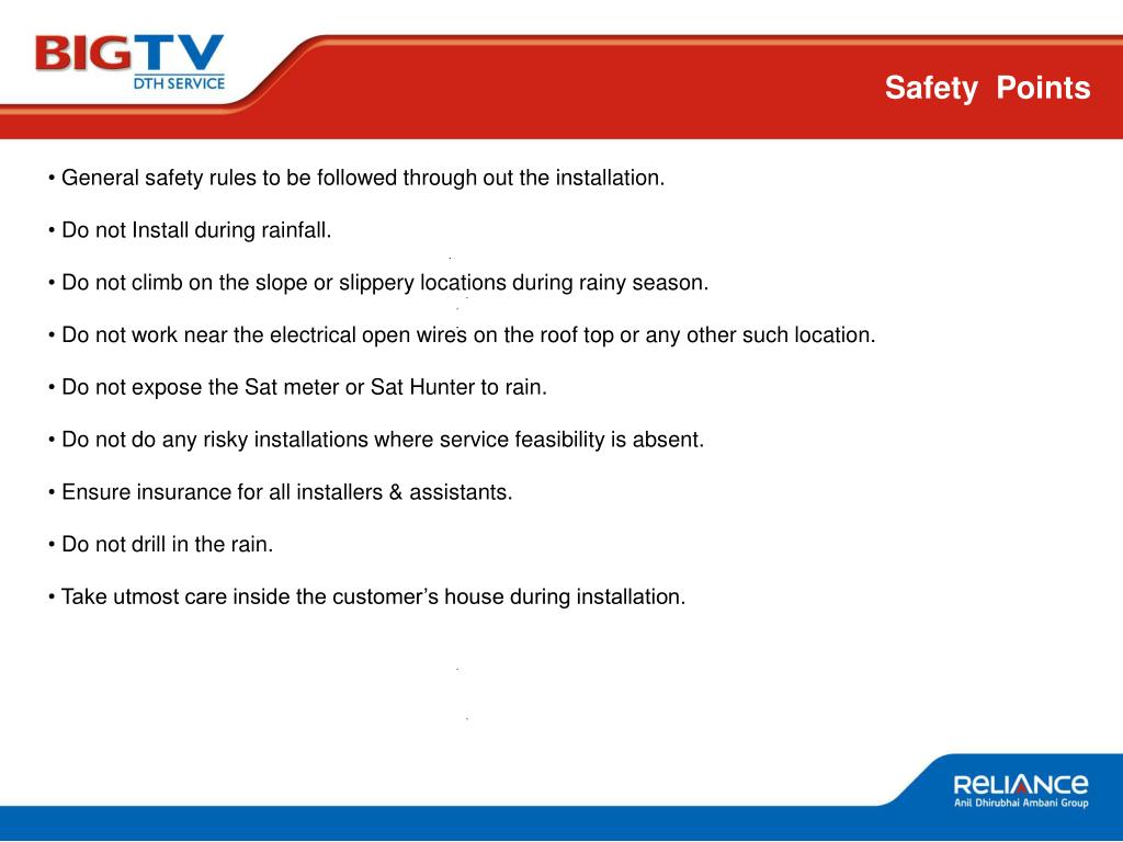 Safety Points • General safety rules to be followed through out the installation. • Do not Install during rainfall. • Do not climb on the slope or slippery locations during rainy season. • Do not work near the electrical open wires on the roof top or any other such location. • Do not expose the Sat meter or Sat Hunter to rain. • Do not do any risky installations where service feasibility is absent. • Ensure insurance for all installers & assistants. • Do not drill in the rain. • Take utmost care inside the customer’s house during installation.