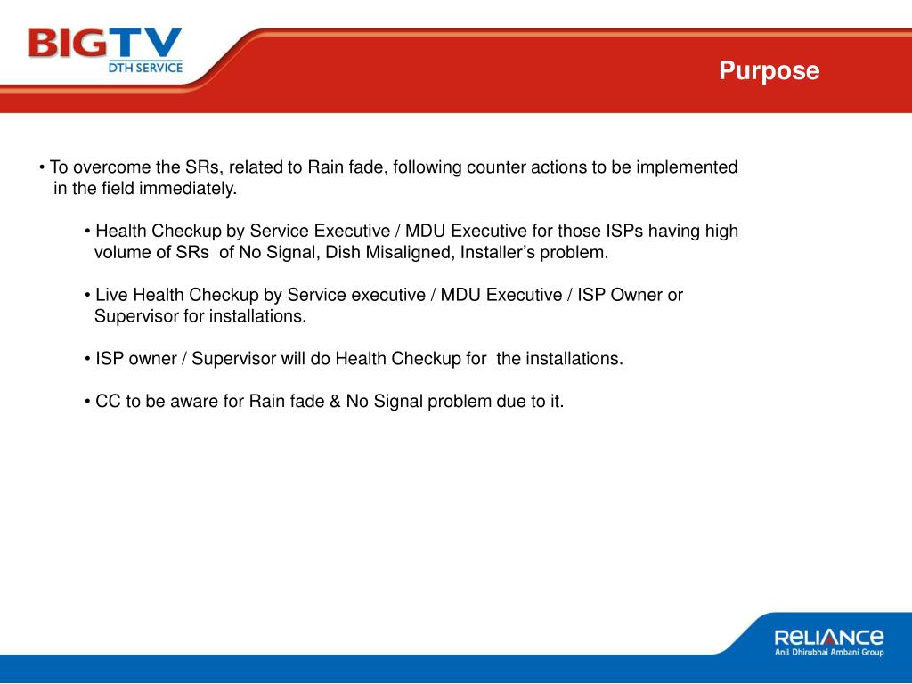 Purpose • To overcome the SRs, related to Rain fade, following counter actions to be implemented • in the field immediately. • Health Checkup by Service Executive / MDU Executive for those ISPs having high • volume of SRs of No Signal, Dish Misaligned, Installer’s problem. • Live Health Checkup by Service executive / MDU Executive / ISP Owner or • Supervisor for installations. • ISP owner / Supervisor will do Health Checkup for the installations. • CC to be aware for Rain fade & No Signal problem due to it.
