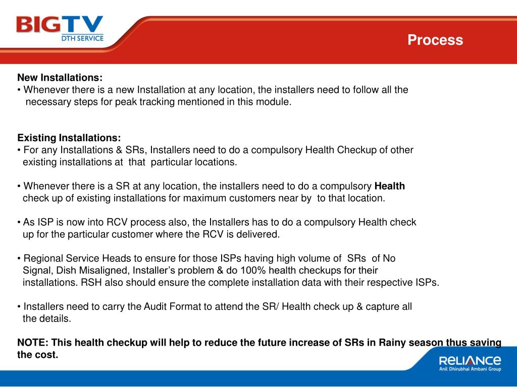 Process • New Installations: • Whenever there is a new Installation at any location, the installers need to follow all the • necessary steps for peak tracking mentioned in this module. • Existing Installations: • For any Installations & SRs, Installers need to do a compulsory Health Checkup of other • existing installations at that particular locations. • Whenever there is a SR at any location, the installers need to do a compulsory Health • check up of existing installations for maximum customers near by to that location. • As ISP is now into RCV process also, the Installers has to do a compulsory Health check • up for the particular customer where the RCV is delivered. • Regional Service Heads to ensure for those ISPs having high volume of SRs of No • Signal, Dish Misaligned, Installer’s problem & do 100% health checkups for their • installations. RSH also should ensure the complete installation data with their respective ISPs. • Installers need to carry the Audit Format to attend the SR/ Health check up & capture all • the details. • NOTE: This health checkup will help to reduce the future increase of SRs in Rainy season thus saving the cost.