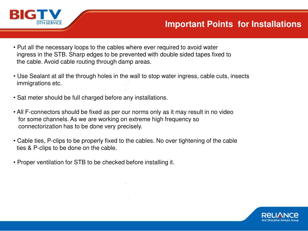 Important Points for Installations • Put all the necessary loops to the cables where ever required to avoid water • ingress in the STB. Sharp edges to be prevented with double sided tapes fixed to • the cable. Avoid cable routing through damp areas. • Use Sealant at all the through holes in the wall to stop water ingress, cable cuts, insects • immigrations etc. • Sat meter should be full charged before any installations. • All F-connectors should be fixed as per our norms only as it may result in no video • for some channels. As we are working on extreme high frequency so • connectorization has to be done very precisely. • Cable ties, P-clips to be properly fixed to the cables. No over tightening of the cable • ties & P-clips to be done on the cable. • Proper ventilation for STB to be checked before installing it.