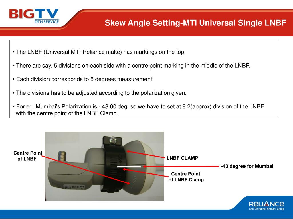 Skew Angle Setting-MTI Universal Single LNBF • The LNBF (Universal MTI-Reliance make) has markings on the top. • There are say, 5 divisions on each side with a centre point marking in the middle of the LNBF. • Each division corresponds to 5 degrees measurement • The divisions has to be adjusted according to the polarization given. • For eg. Mumbai’s Polarization is - 43.00 deg, so we have to set at 8.2(approx) division of the LNBF • with the centre point of the LNBF Clamp. Centre Point of LNBF LNBF CLAMP -43 degree for Mumbai Centre Point of LNBF Clamp