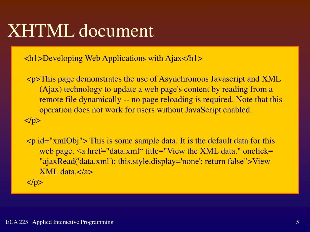 XHTML document <h1>Developing Web Applications with Ajax</h1> <p>This page demonstrates the use of Asynchronous Javascript and XML (Ajax) technology to update a web page's content by reading from a remote file dynamically -- no page reloading is required. Note that this operation does not work for users without JavaScript enabled. </p> <p id="xmlObj"> This is some sample data. It is the default data for this web page. <a href="data.xml“ title="View the XML data." onclick= "ajaxRead('data.xml'); this.style.display='none'; return false">View XML data.</a> </p> ECA 225 Applied Interactive Programming