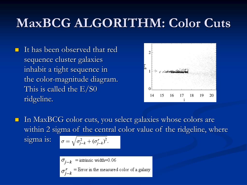MaxBCG ALGORITHM: Color Cuts • It has been observed that red sequence cluster galaxies inhabit a tight sequence in the color-magnitude diagram. This is called the E/S0 ridgeline. • In MaxBCG color cuts, you select galaxies whose colors are within 2 sigma of the central color value of the ridgeline, where sigma is: