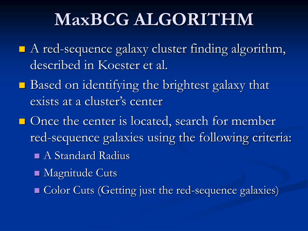 MaxBCG ALGORITHM • A red-sequence galaxy cluster finding algorithm, described in Koester et al. • Based on identifying the brightest galaxy that exists at a cluster’s center • Once the center is located, search for member red-sequence galaxies using the following criteria: • A Standard Radius • Magnitude Cuts • Color Cuts (Getting just the red-sequence galaxies)