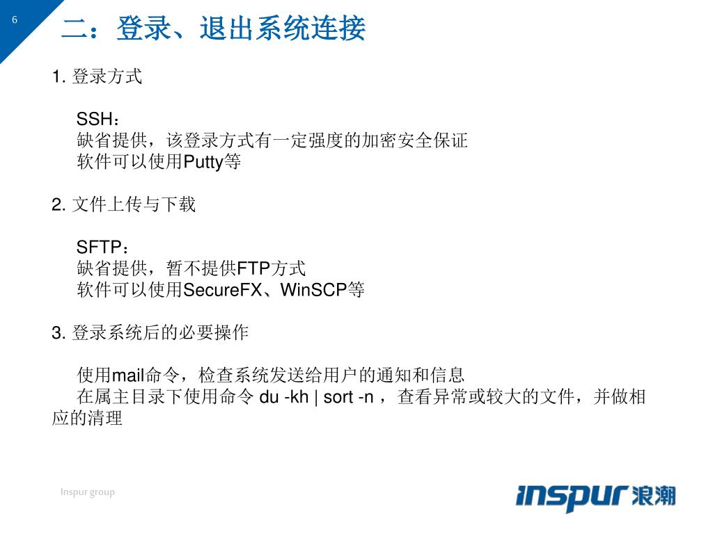 二:登录、退出系统连接 1. 登录方式 SSH: 缺省提供,该登录方式有一定强度的加密安全保证 软件可以使用Putty等 2. 文件上传与下载 SFTP: 缺省提供,暂不提供FTP方式 软件可以使用SecureFX、WinSCP等 3. 登录系统后的必要操作 使用mail命令,检查系统发送给用户的通知和信息 在属主目录下使用命令 du -kh | sort -n ,查看异常或较大的文件,并做相应的清理 Inspur group