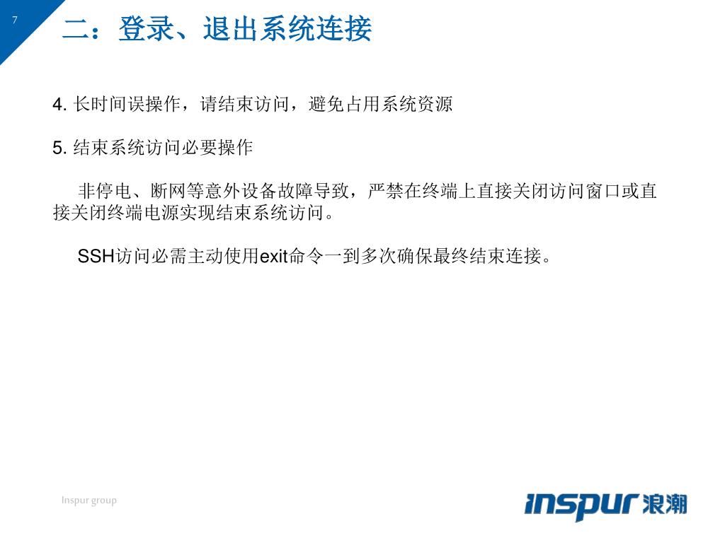 二:登录、退出系统连接 4. 长时间误操作,请结束访问,避免占用系统资源 5. 结束系统访问必要操作 非停电、断网等意外设备故障导致,严禁在终端上直接关闭访问窗口或直接关闭终端电源实现结束系统访问。 SSH访问必需主动使用exit命令一到多次确保最终结束连接。 Inspur group