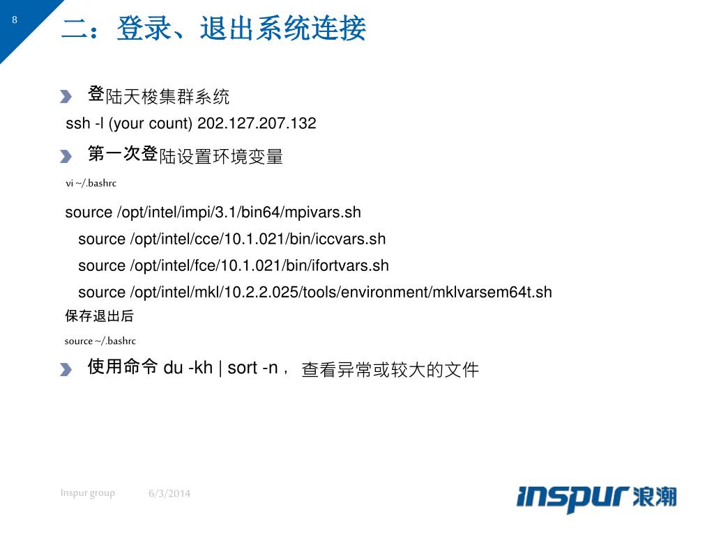 二:登录、退出系统连接 Inspur group • 登陆天梭集群系统 ssh -l (your count) 202.127.207.132 • 第一次登陆设置环境变量 vi ~/.bashrc source /opt/intel/impi/3.1/bin64/mpivars.sh source /opt/intel/cce/10.1.021/bin/iccvars.sh source /opt/intel/fce/10.1.021/bin/ifortvars.sh source /opt/intel/mkl/10.2.2.025/tools/environment/mklvarsem64t.sh 保存退出后 source ~/.bashrc • 使用命令du -kh | sort -n ,查看异常或较大的文件 6/3/2014