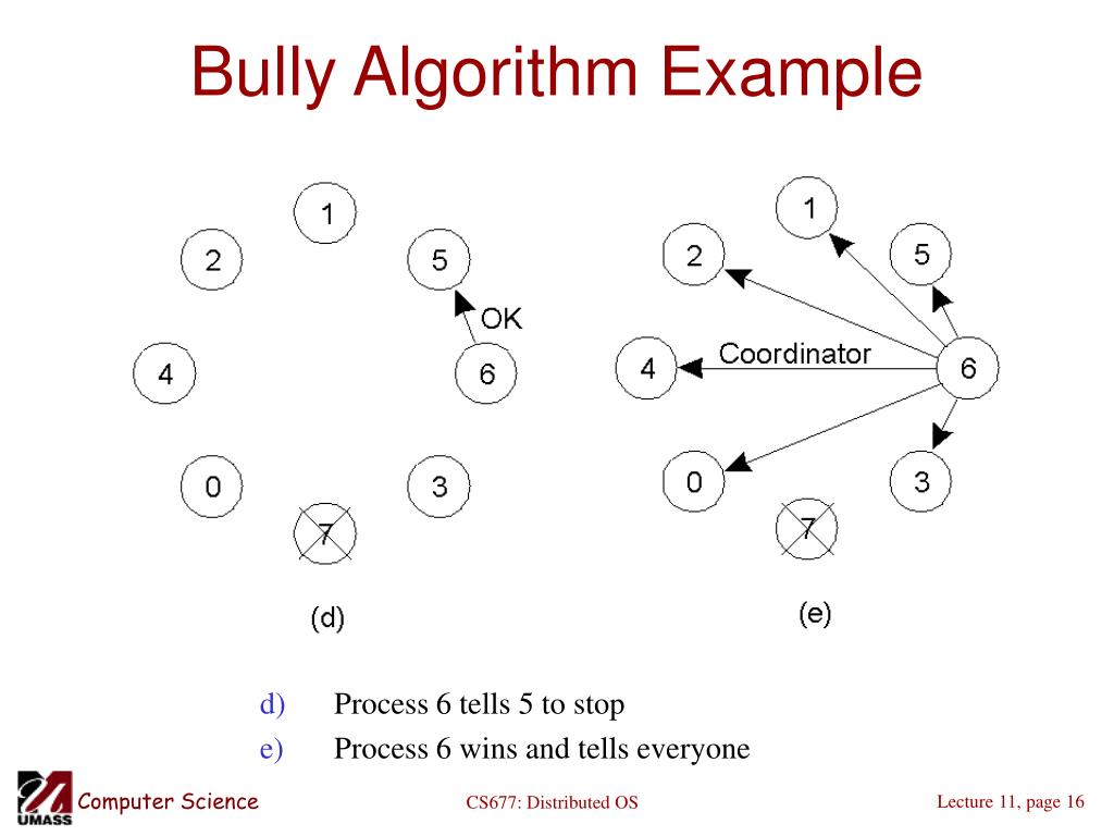 Bully Algorithm Example • Process 6 tells 5 to stop • Process 6 wins and tells everyone CS677: Distributed OS