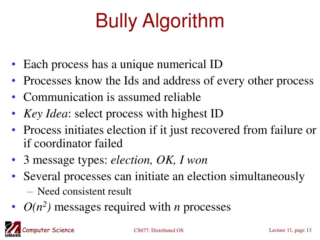 Bully Algorithm • Each process has a unique numerical ID • Processes know the Ids and address of every other process • Communication is assumed reliable • Key Idea: select process with highest ID • Process initiates election if it just recovered from failure or if coordinator failed • 3 message types: election, OK, I won • Several processes can initiate an election simultaneously • Need consistent result • O(n2) messages required with n processes CS677: Distributed OS