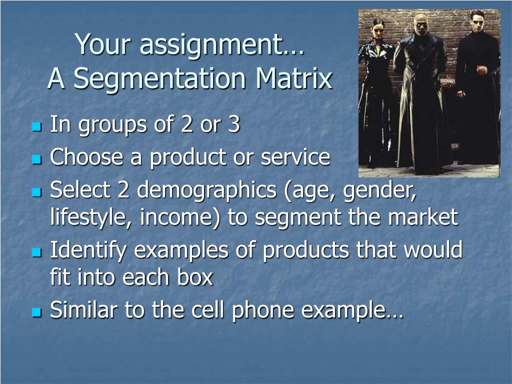 Your assignment…A Segmentation Matrix • In groups of 2 or 3 • Choose a product or service • Select 2 demographics (age, gender, lifestyle, income) to segment the market • Identify examples of products that would fit into each box • Similar to the cell phone example…