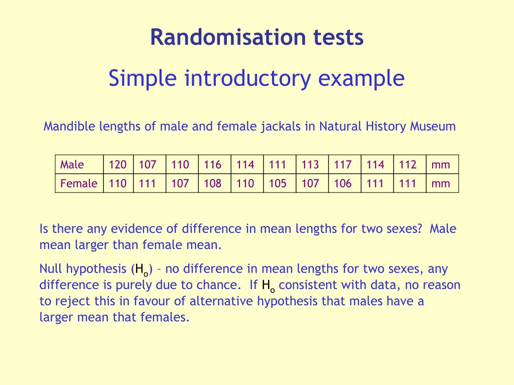Randomisation testsSimple introductory example Mandible lengths of male and female jackals in Natural History Museum Is there any evidence of difference in mean lengths for two sexes? Male mean larger than female mean. Null hypothesis (Ho) – no difference in mean lengths for two sexes, any difference is purely due to chance. If Ho consistent with data, no reason to reject this in favour of alternative hypothesis that males have a larger mean that females.