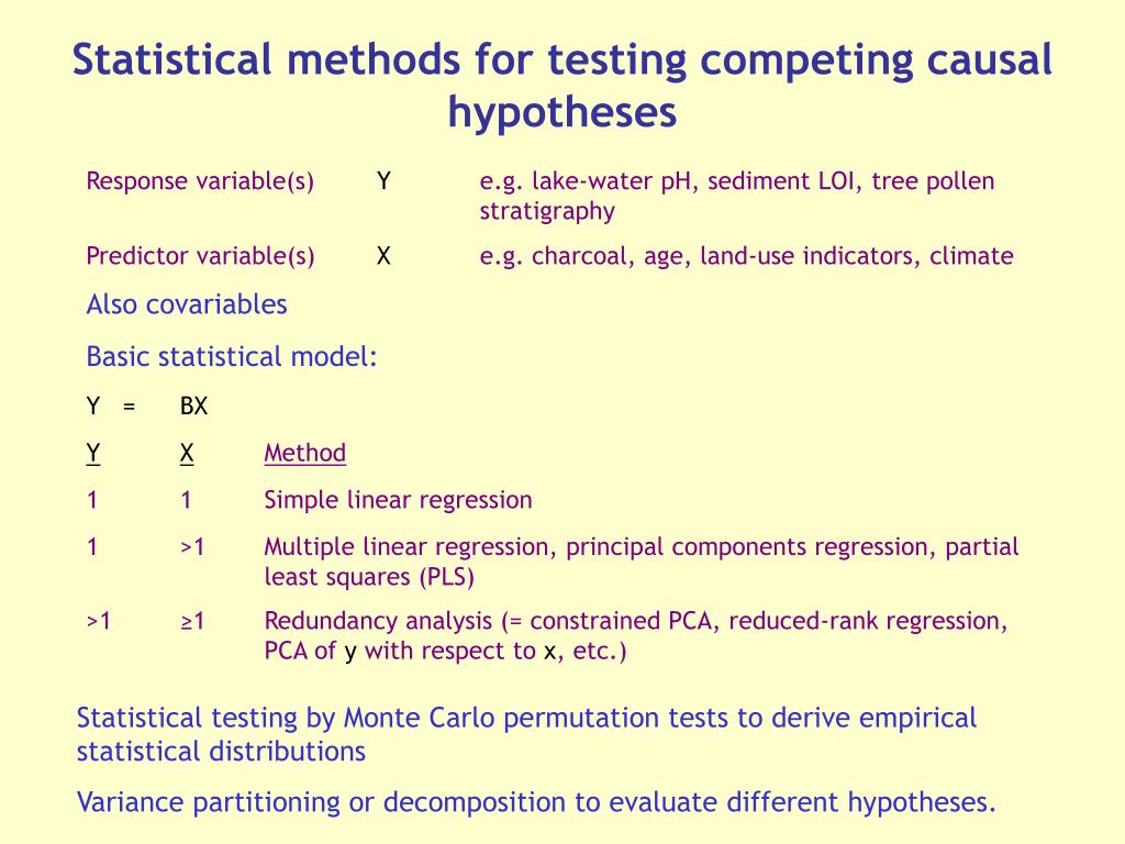 Statistical methods for testing competing causal hypotheses Also covariables Basic statistical model: Statistical testing by Monte Carlo permutation tests to derive empirical statistical distributions Variance partitioning or decomposition to evaluate different hypotheses.