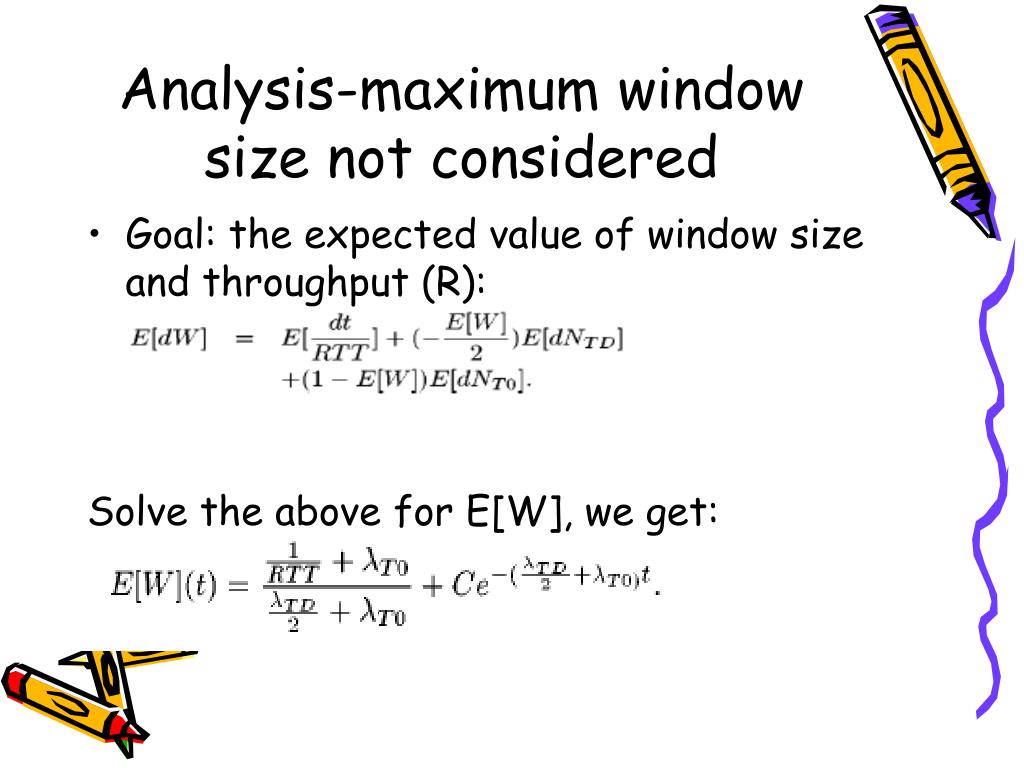 Analysis-maximum window size not considered • Goal: the expected value of window size and throughput (R): Solve the above for E[W], we get: