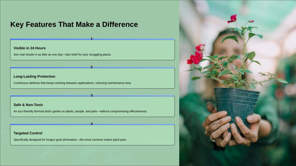 Key Features That Make a Difference 1 Visible in 24 Hours See real results in as little as one day—fast relief for your struggling plants. 2 Long-Lasting Protection Continuous defense that keeps working between applications, reducing maintenance time. 3 Safe & Non-Toxic An eco-friendly formula that's gentle on plants, people, and pets—without compromising effectiveness. 4 Targeted Control Specifically designed for fungus gnat elimination—the most common indoor plant pest.