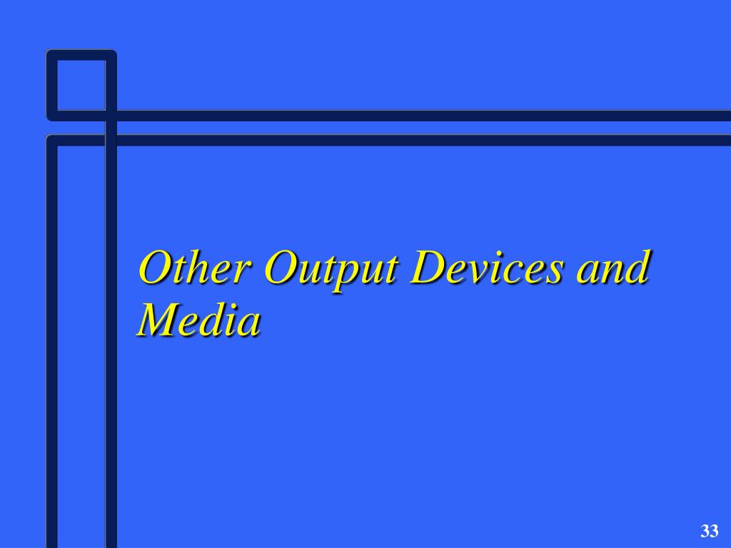 Spools and Buffers • Spooling software allows data to be stored temporarily on a magnetic storage medium, usually a disk, until the printer is ready to print it. • Buffers, like the CPU’s RAM, are temporary holding areas inside the output device that attempt to compensate for the difference in CPU and output device speeds.