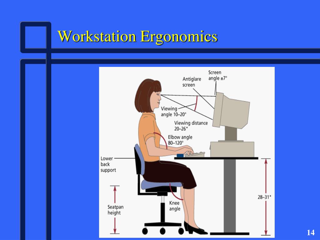 Monitor Ergonomics • The science of studying the interaction of humans and office equipment is called ergonomics. • There has been concern that electromagnetic emissions from computer monitors, particularly those in the 5 Hz to 400 KHz range, might cause cancer or affect pregnancies. • Another cause for concern has been physical maladies such as carpal tunnel syndrome.