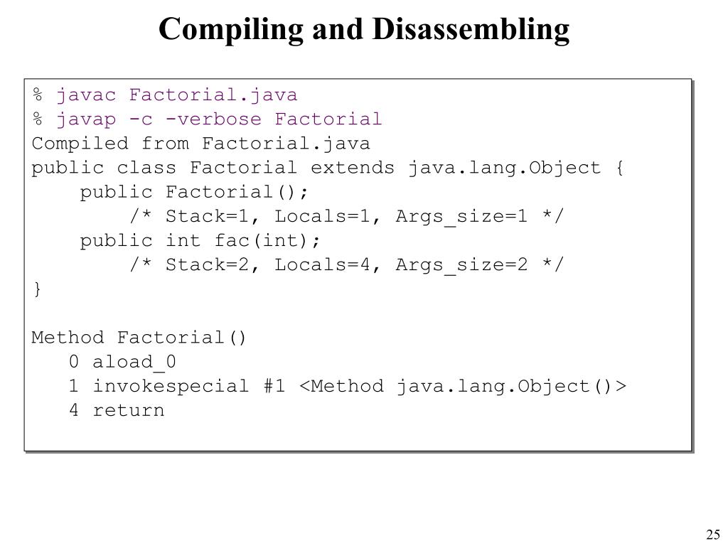Compiling and Disassembling % javac Factorial.java % javap -c -verbose Factorial Compiled from Factorial.java public class Factorial extends java.lang.Object { public Factorial(); /* Stack=1, Locals=1, Args_size=1 */ public int fac(int); /* Stack=2, Locals=4, Args_size=2 */ } Method Factorial() 0 aload_0 1 invokespecial #1 <Method java.lang.Object()> 4 return