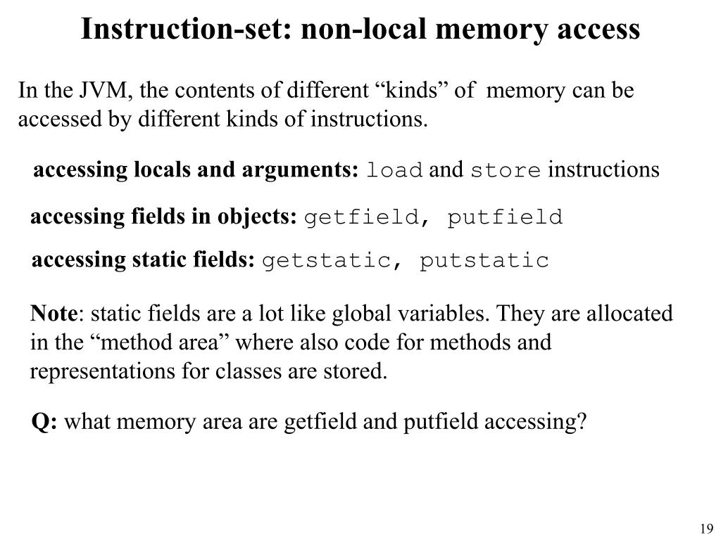 Instruction-set: non-local memory access In the JVM, the contents of different “kinds” of memory can be accessed by different kinds of instructions. accessing locals and arguments: load and store instructions accessing fields in objects:getfield, putfield accessing static fields:getstatic, putstatic Note: static fields are a lot like global variables. They are allocated in the “method area” where also code for methods and representations for classes are stored. Q: what memory area are getfield and putfield accessing?