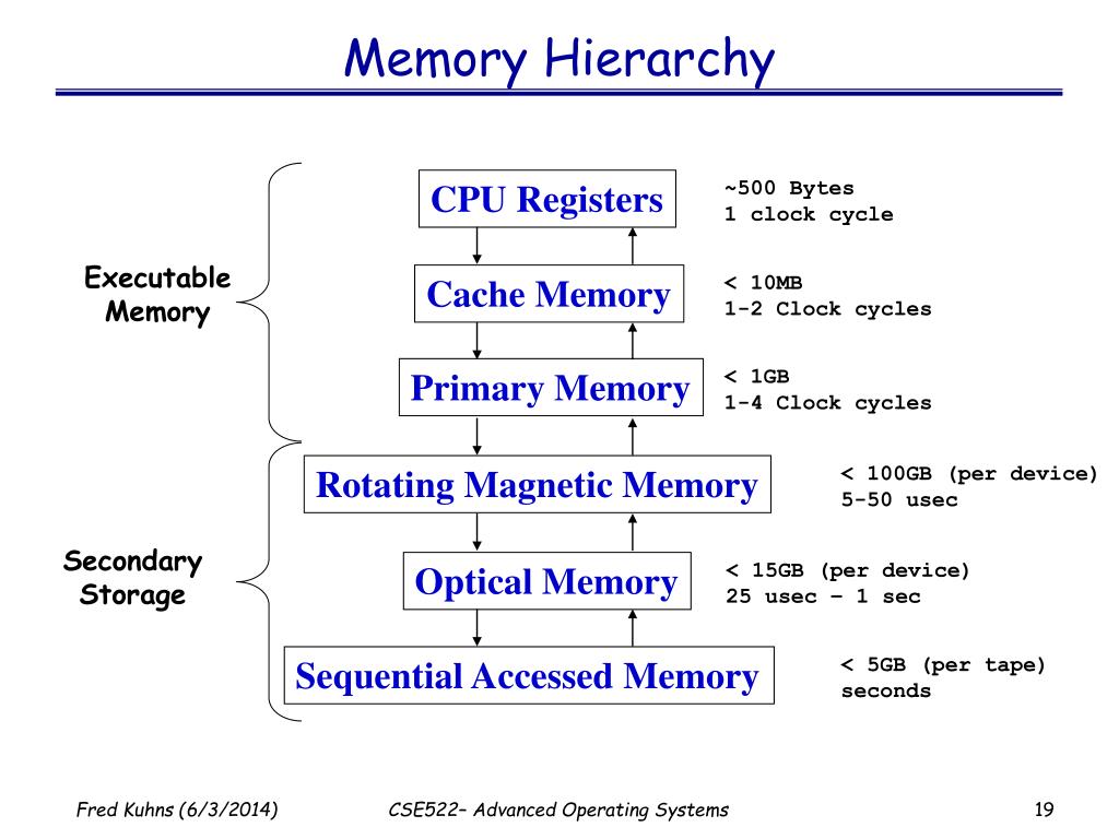 Memory Hierarchy ~500 Bytes 1 clock cycle CPU Registers Executable Memory < 10MB 1-2 Clock cycles Cache Memory < 1GB 1-4 Clock cycles Primary Memory < 100GB (per device) 5-50 usec Rotating Magnetic Memory Secondary Storage < 15GB (per device) 25 usec – 1 sec Optical Memory < 5GB (per tape) seconds Sequential Accessed Memory CSE522– Advanced Operating Systems