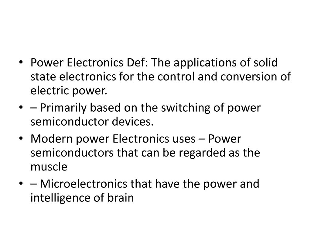 Power Electronics Def: The applications of solid state electronics for the control and conversion of electric power. • – Primarily based on the switching of power semiconductor devices. • Modern power Electronics uses – Power semiconductors that can be regarded as the muscle • – Microelectronics that have the power and intelligence of brain