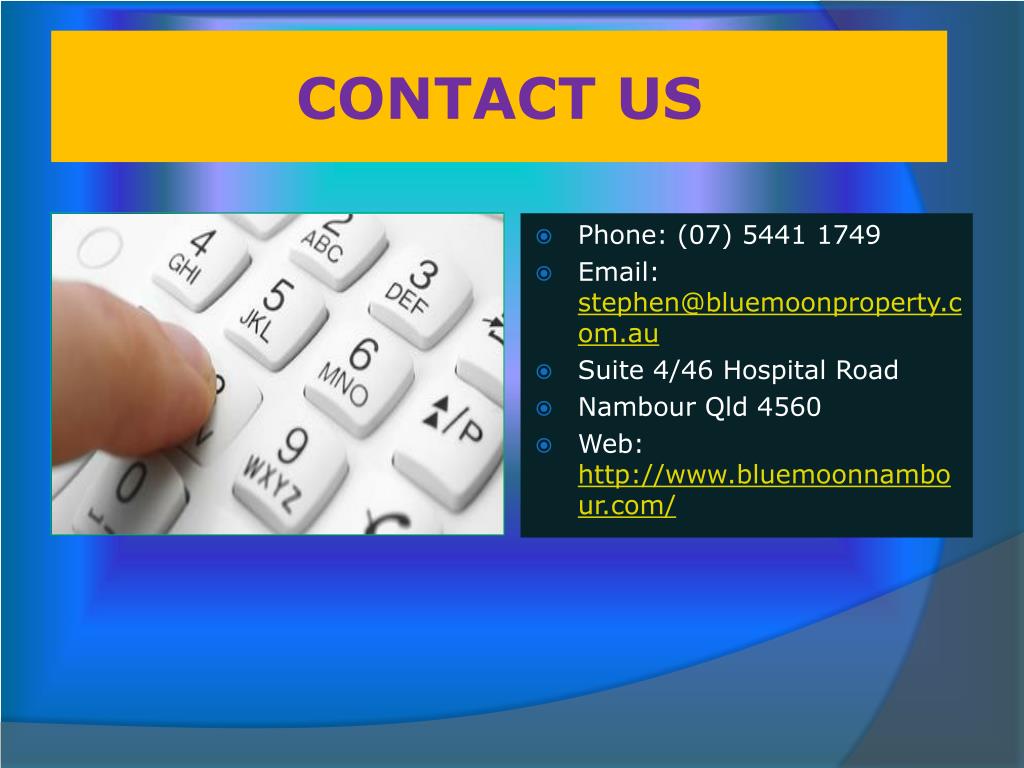 CONTACT US • Phone: (07) 5441 1749 • Email: stephen@bluemoonproperty.com.au • Suite 4/46 Hospital Road • Nambour Qld 4560 • Web: http://www.bluemoonnambour.com/