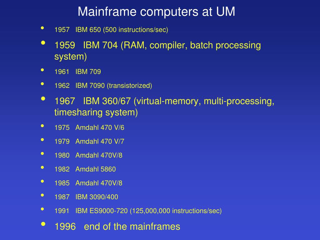 Mainframe computers at UM • 1957 IBM 650 (500 instructions/sec) • 1959 IBM 704 (RAM, compiler, batch processing system) • 1961 IBM 709 • 1962 IBM 7090 (transistorized) • 1967 IBM 360/67 (virtual-memory, multi-processing, timesharing system) • 1975 Amdahl 470 V/6 • 1979 Amdahl 470 V/7 • 1980 Amdahl 470V/8 • 1982 Amdahl 5860 • 1985 Amdahl 470V/8 • 1987 IBM 3090/400 • 1991 IBM ES9000-720 (125,000,000 instructions/sec) • 1996 end of the mainframes
