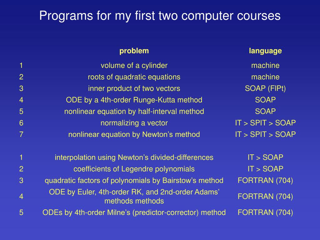 The required introductory computing course for all 2nd-year engineering students at UM in 1962 • taught by Math Department and Computing Center staff • one credit (1 hr lecture, 1 hr lab) • 500 students per semester • 16 lectures: 6 on the language (MAD)2 on hardware1 on number systems and arithmetic1 on computational error5 on numerical and statistical methods1 on searching and sorting algorithms • 4 problems on the IBM 704/709/7090 (batch processing)