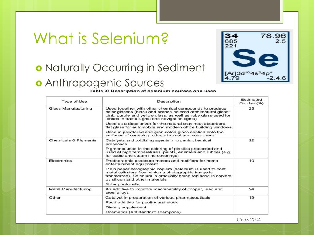 What is Selenium? • Naturally Occurring in Sediment • Anthropogenic Sources USGS 2004