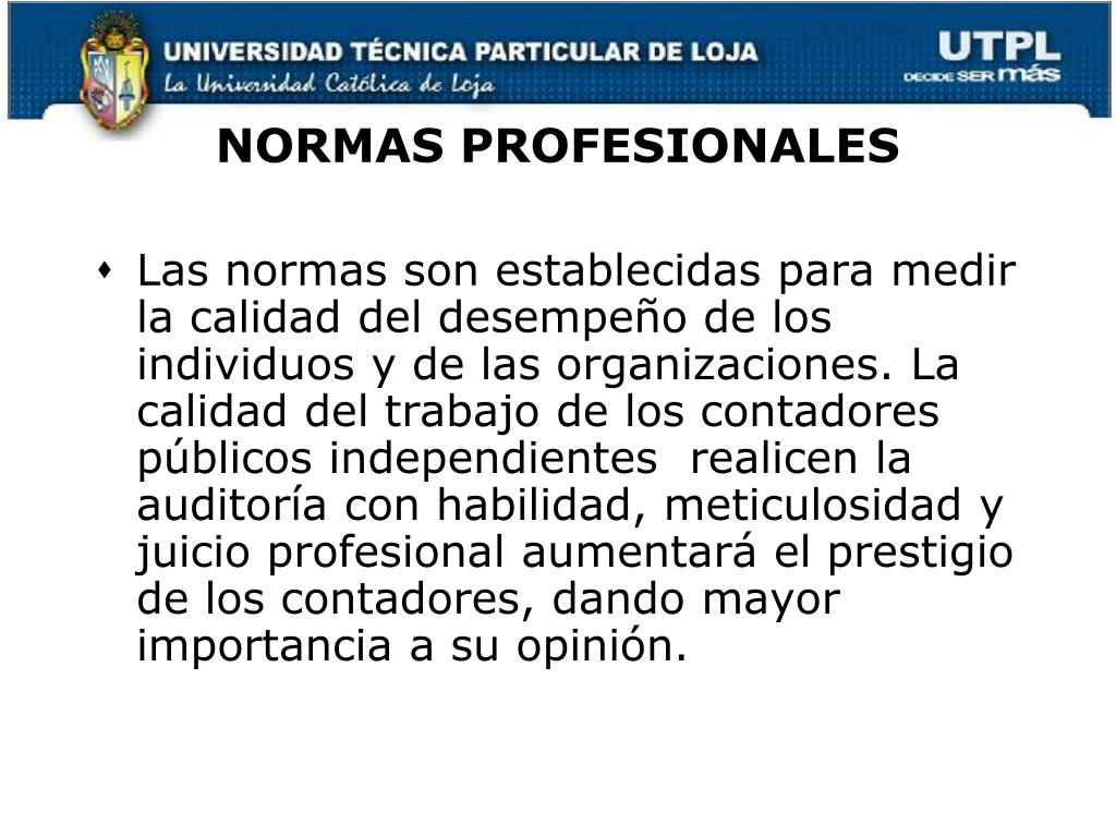 NORMAS PROFESIONALES • Las normas son establecidas para medir la calidad del desempeño de los individuos y de las organizaciones. La calidad del trabajo de los contadores públicos independientes realicen la auditoría con habilidad, meticulosidad y juicio profesional aumentará el prestigio de los contadores, dando mayor importancia a su opinión.